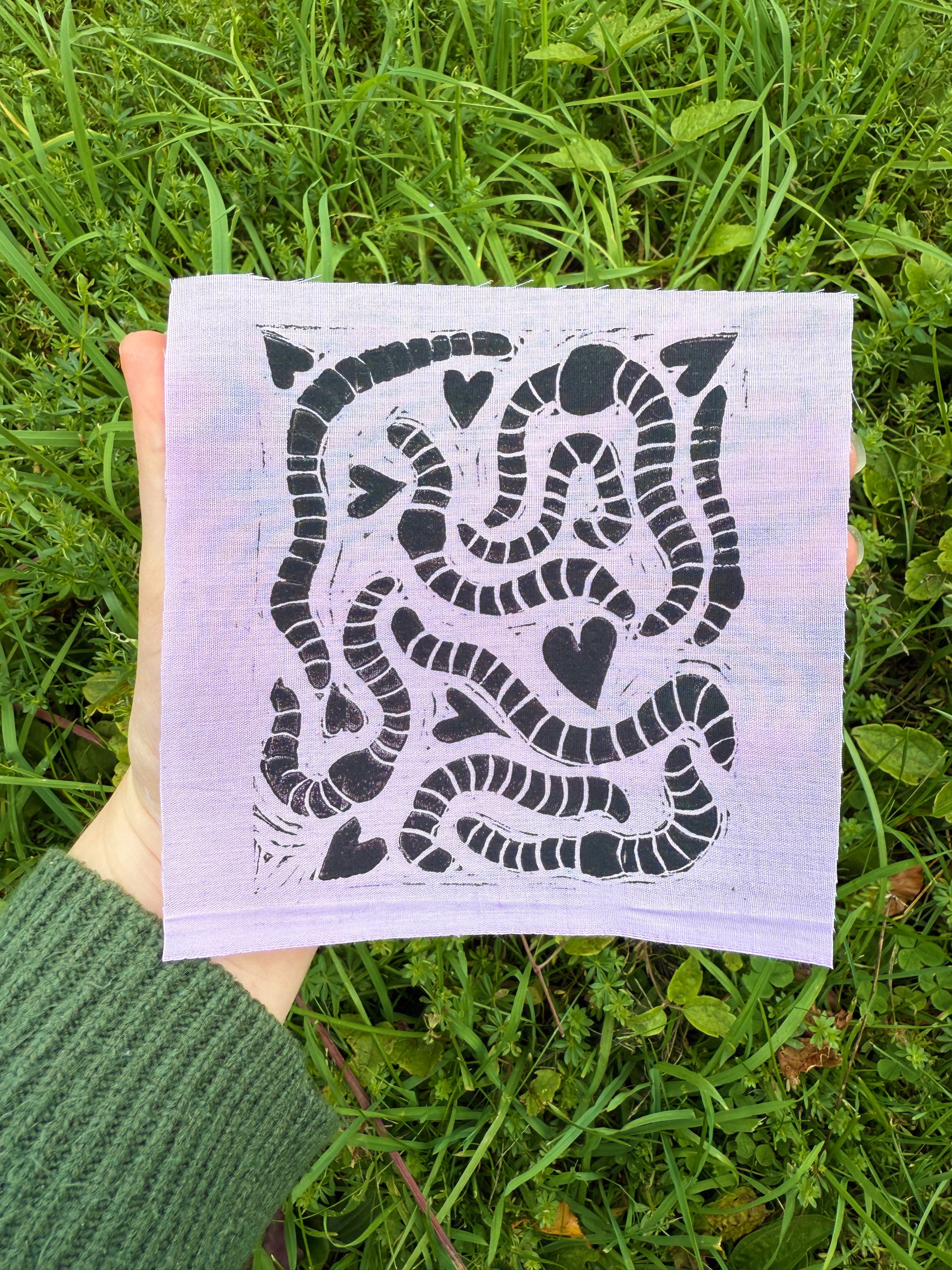 Perfect for your bag, your jacket, or anywhere else thats in desperate need of worms, this linoprint patch is printed onto polycotton using water resistant fabric ink.